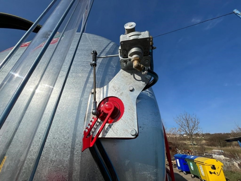 Na cisterně je agregováno mnoho doplňků pro větší komfort. Když začneme hned u traktoru, cisterna je vybavena závěsem K80, hydraulicky odpruženou oj, měrkou stavu naplněnosti nebo robustní vývěvou. V zadní části je to například LED skupinové i výstražné osvětlení v horní části cisterny. V zadní části nemáme aplikátor, ale standardní hydraulické šoupě + mechanické šoupě s rychloupáním. Při předání byla nasazena jak tryska, tak miska pro rozstříknutí. Tato miska kejdu rozmptýlí v pracovním záběru daném dle aktuálního výkonu čerpadla. Tímto je možné stanovovat aplikované množství kejdy na 1 ha. Dále je dávka kejdy na 1 ha ovlivněna rychlostí soupravy.